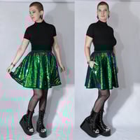 Iridescent green sequin circle skirt lined with black cotton. Opens down the front with black snaps. Side seam pockets. Elastic waistband.